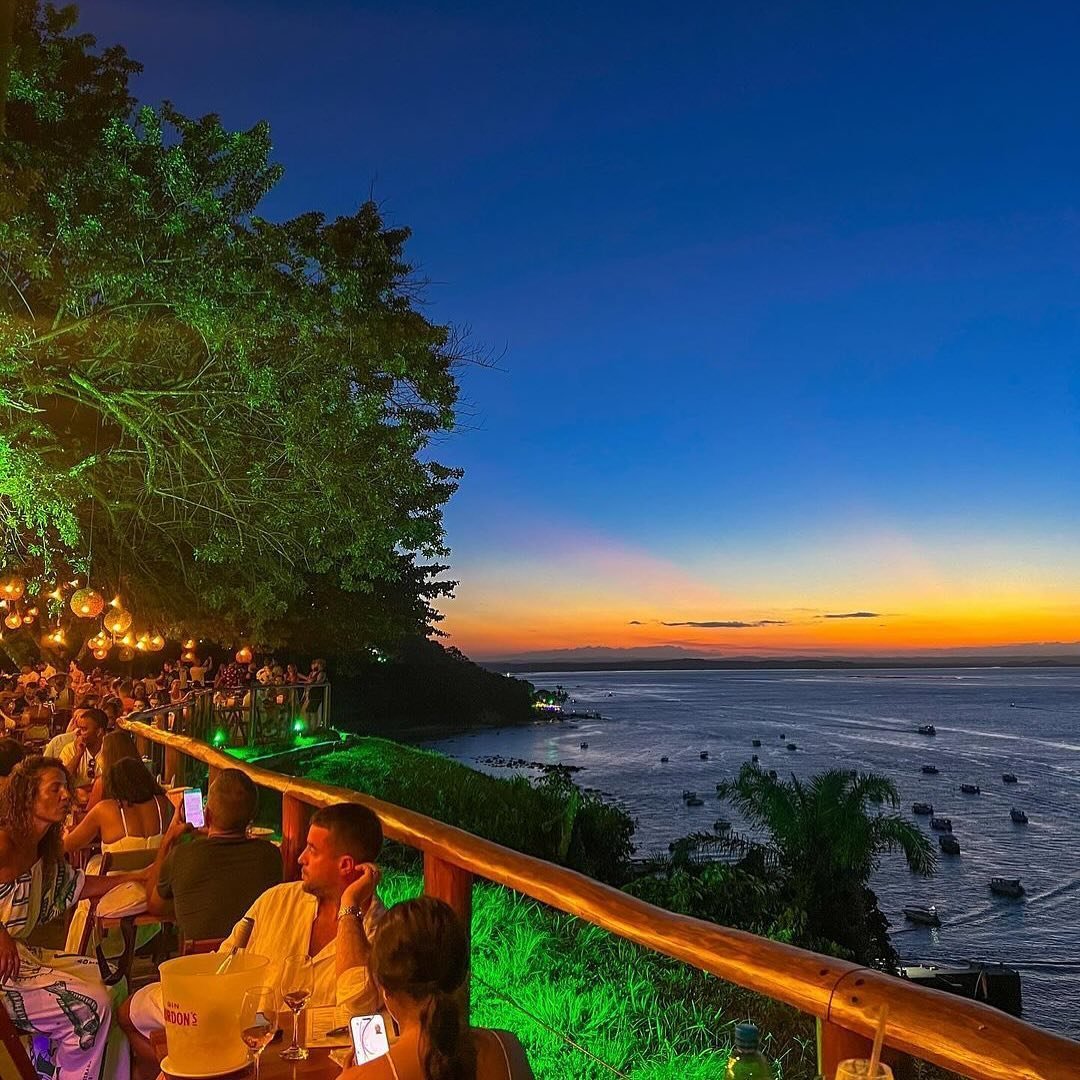 Quando a noite chega de vez, a vila ganha vida. As ruas ficam cheias de música, artistas, apresentações culturais e aquele clima descontraído típico da Bahia. É comum encontrar apresentações de teatro de rua, músicos tocando ao vivo e pessoas caminhando entre lojinhas, bares e restaurantes iluminados, criando uma atmosfera encantadora. Um dos lugares mais famosos da noite é o lendário Mama Africa. O restaurante se transforma em uma grande festa, com música animada, gente dançando, drinks coloridos e uma energia contagiante que atrai visitantes do mundo inteiro. É praticamente impossível passar por lá e não sentir vontade de entrar.