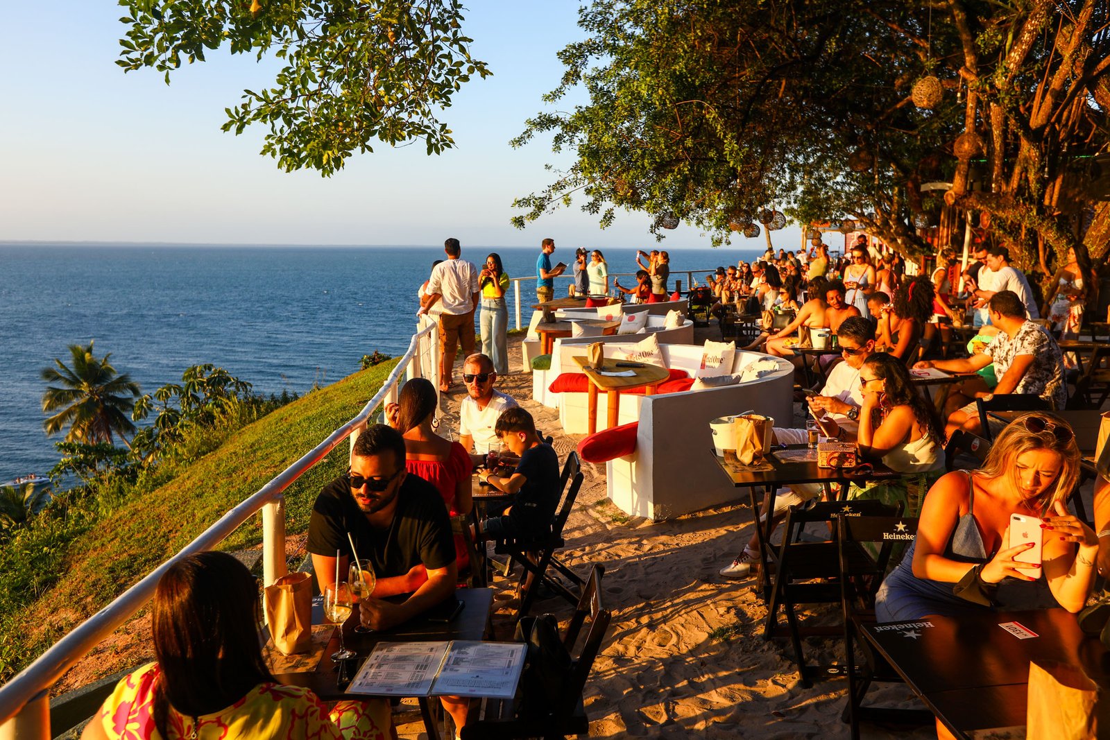 A noite em Morro de São Paulo é simplesmente inesquecível. Quando o sol se põe e o céu ganha tons dourados e alaranjados sobre o mar, a ilha se transforma em um verdadeiro espetáculo de energia, música e sabores. Tudo começa com um dos momentos mais mágicos do dia: o pôr do sol na Toca do Morcego. Lá do alto, com uma vista espetacular para o mar, pessoas do mundo inteiro se reúnem para celebrar o fim da tarde com boa música, drinks e uma atmosfera vibrante. É um daqueles momentos que ficam gravados na memória.