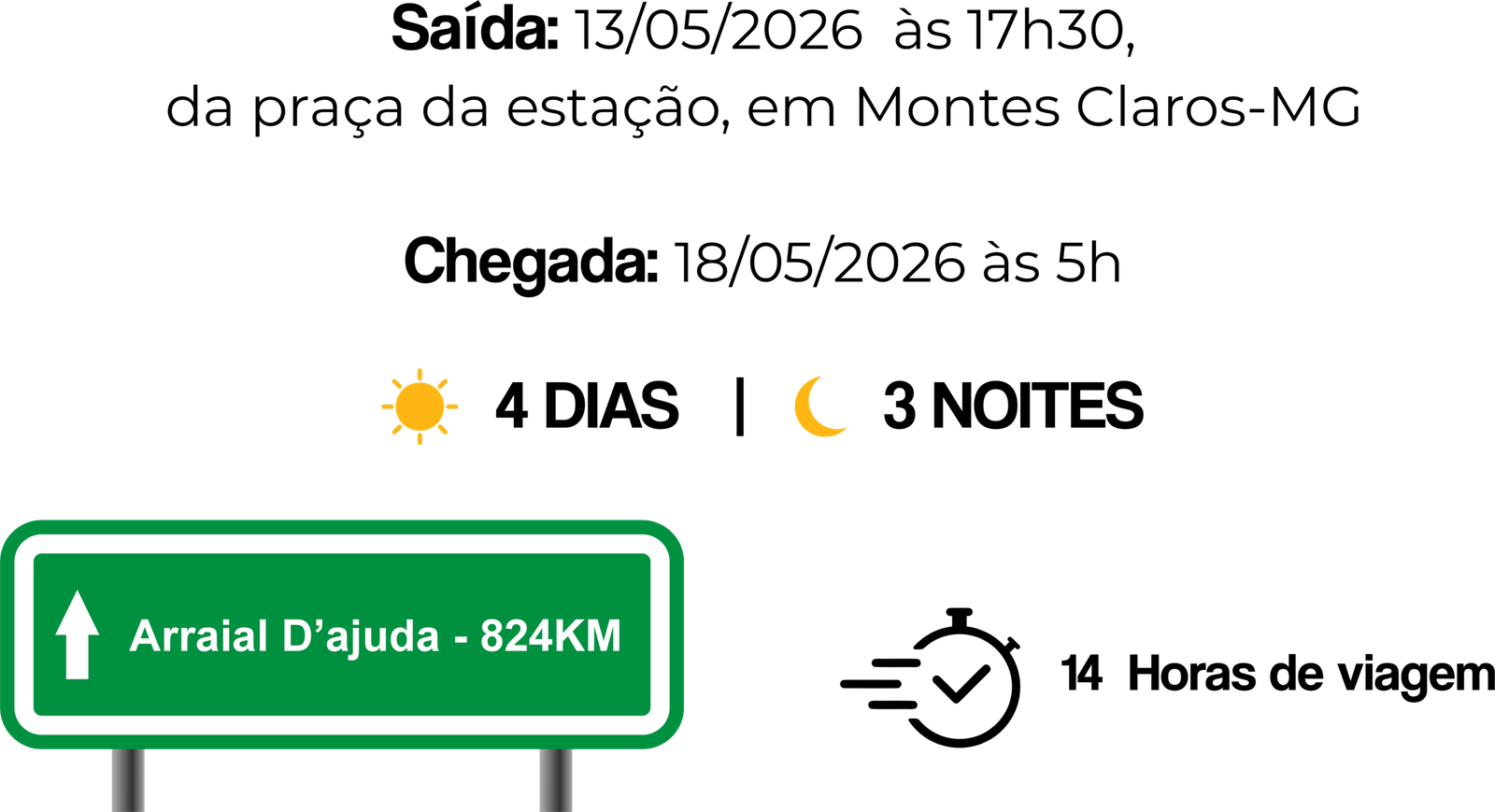 Apresentação às 17h30 na Av. Ovídio de Abreu, Nº 05 e saída pontual ás 18h00 destino ao Arraial d’Ajuda-BA