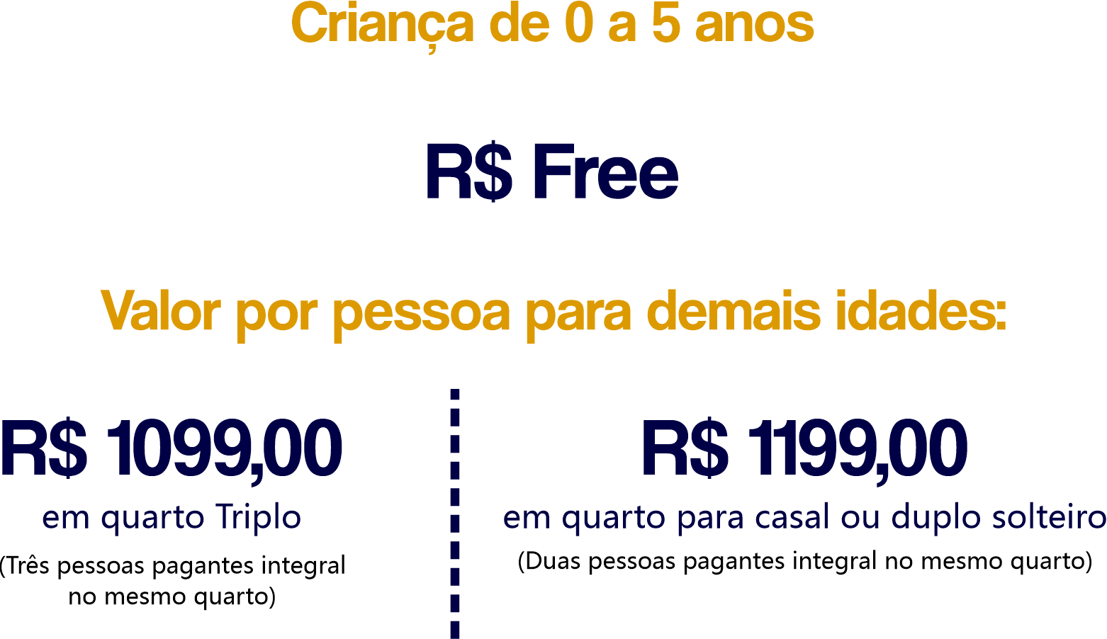 • Entrada de 30% no ato da reserva e o restante ate 5 dias antes do embarque.
